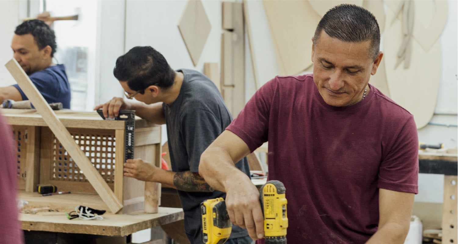 Trabajamos de la mano con artesanos que saben cómo optimizar sus recursos. Por ejemplo, nuestra ceramista utiliza agua de lluvia en su proceso de producción. Junto a estos talentosos artesanos, creamos piezas únicas a partir de maderas rescatadas, preservando técnicas tradicionales y apoyando el desarrollo sostenible de sus comunidades.